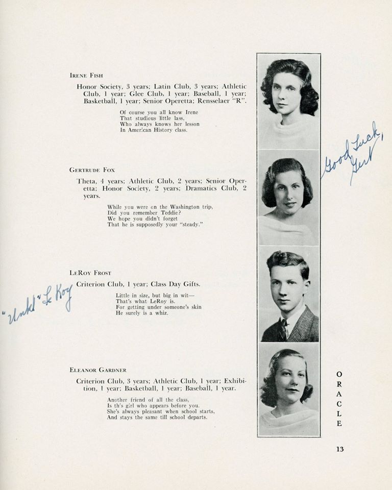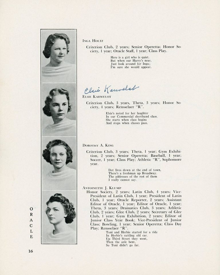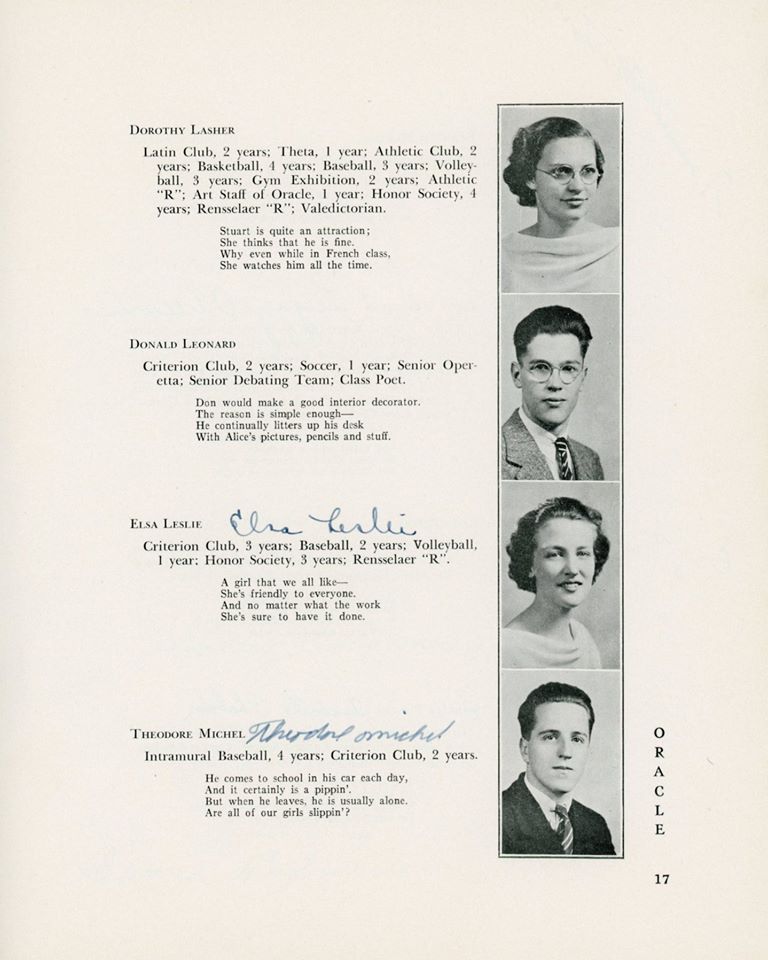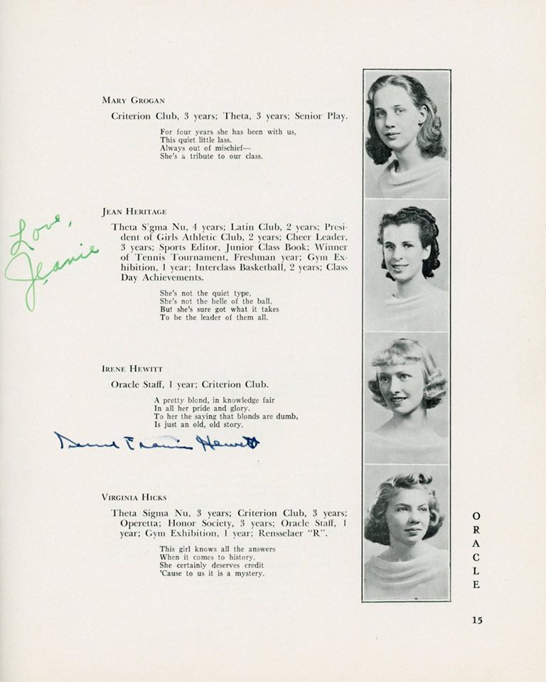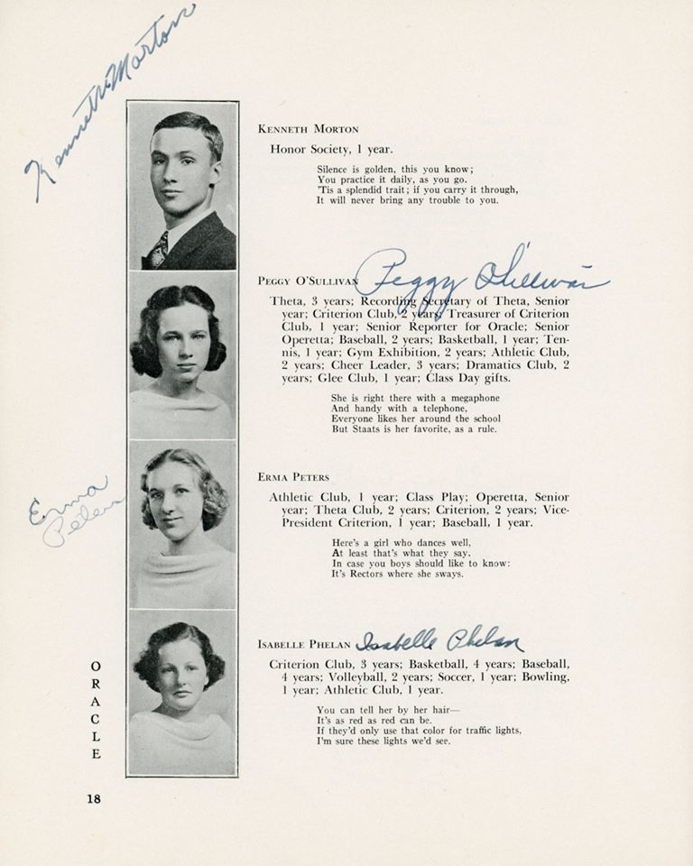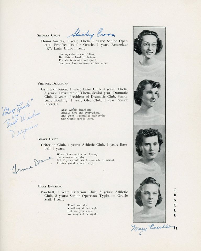 | Ethel Barrett (D) Elizabeth Barrington (D) Betty "Betty" (Flanigan) Bell (D) Richard Carlson (D) Robert Chestnut (D) Douglas R Childrose (D) Mary (Clarke) Ciprioni (D) Helen Cook (D) Shirley Cross (D) Virginia Dearborn (D) Grace Drew (D) Mabel M (Betz) Erickson (D) Mary Ewashko (D) Eleanor Faas (D) Staats Fasoldt (D) George I Featherly (D) Jack Felts (D) Irene Fish (D) Gertrude Fox (D) Mildred (Reed) Fox (D) LeRoy Frost (D) Eleanor Gardner (D) Mildred Goss (D) Marcia Grainer (D) Kate Griebsch (D) Margot Griebsch (D) Mary Grogan (D) Jean Heritage (D) Irene Hewitt (D) Virginia Hicks (D) Inga Holtz (D) | Dorothy A King (D) Antoinette J Klump (D) Dorothy Lasher (D) Donald Leonard (D) Elsa Leslie (D) Ralph Mason (D) Theodore Michel (D) Kenneth Morton (D) Peggy O'Sullivan (D) Erma Peters (D) Isabelle Phelan (D) Kathryn Phelan (D) Jeannette Phelps (D) Shirley Constance Primmer (D) Frederick Rabe (D) George Rajkowich (D) Josephine F Rooney (D) Roger Rounds (D) Laura Russell (D) Charlotte Sangmaster (D) Marjorie (Burhans) Schmidt (D) Agnes Sickels (D) Doris Slawson (D) Marian Sornberger (D) Aurelia Sullivan (D) Norma Sweet (D) Jean Paul Vadnais (D) Stuart Wilt (D) Elsie Wishart (D) | ||