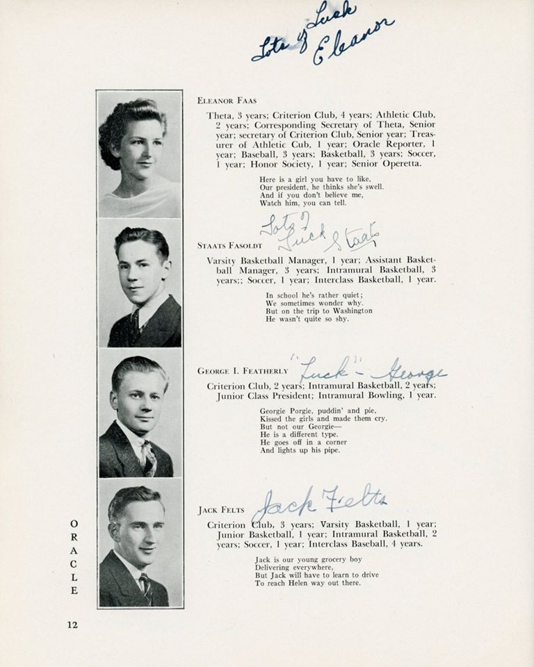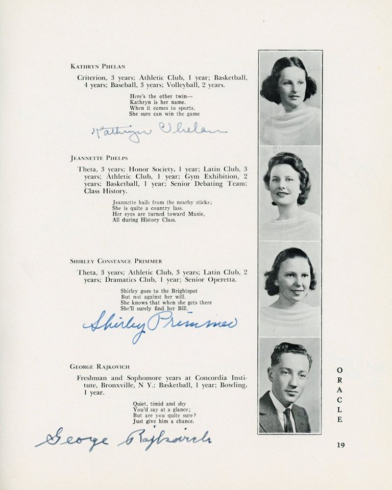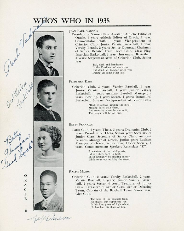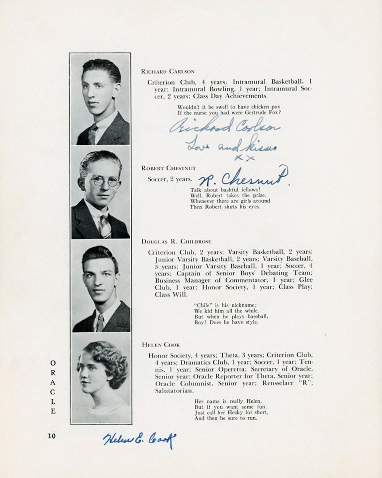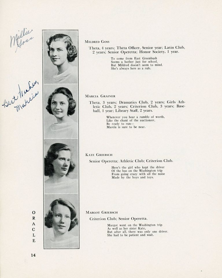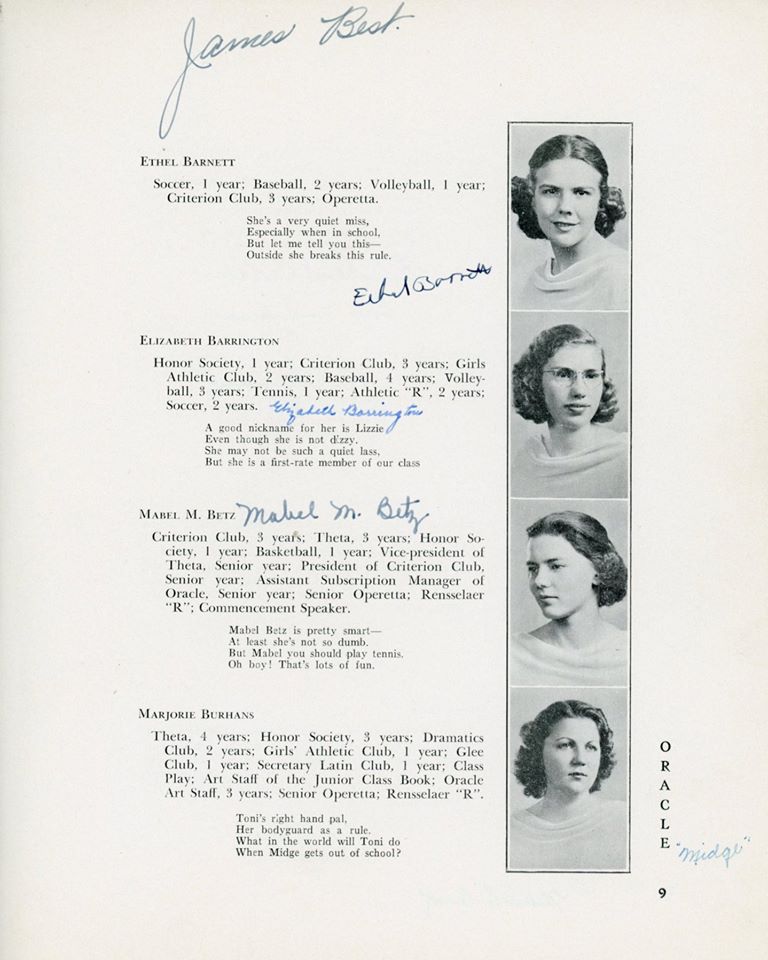 | Ethel Barrett (D) Elizabeth Barrington (D) Betty "Betty" (Flanigan) Bell (D) Richard Carlson (D) Robert Chestnut (D) Douglas R Childrose (D) Mary (Clarke) Ciprioni (D) Helen Cook (D) Shirley Cross (D) Virginia Dearborn (D) Grace Drew (D) Mabel M (Betz) Erickson (D) Mary Ewashko (D) Eleanor Faas (D) Staats Fasoldt (D) George I Featherly (D) Jack Felts (D) Irene Fish (D) Gertrude Fox (D) Mildred (Reed) Fox (D) LeRoy Frost (D) Eleanor Gardner (D) Mildred Goss (D) Marcia Grainer (D) Kate Griebsch (D) Margot Griebsch (D) Mary Grogan (D) Jean Heritage (D) Irene Hewitt (D) Virginia Hicks (D) Inga Holtz (D) | Dorothy A King (D) Antoinette J Klump (D) Dorothy Lasher (D) Donald Leonard (D) Elsa Leslie (D) Ralph Mason (D) Theodore Michel (D) Kenneth Morton (D) Peggy O'Sullivan (D) Erma Peters (D) Isabelle Phelan (D) Kathryn Phelan (D) Jeannette Phelps (D) Shirley Constance Primmer (D) Frederick Rabe (D) George Rajkowich (D) Josephine F Rooney (D) Roger Rounds (D) Laura Russell (D) Charlotte Sangmaster (D) Marjorie (Burhans) Schmidt (D) Agnes Sickels (D) Doris Slawson (D) Marian Sornberger (D) Aurelia Sullivan (D) Norma Sweet (D) Jean Paul Vadnais (D) Stuart Wilt (D) Elsie Wishart (D) | ||